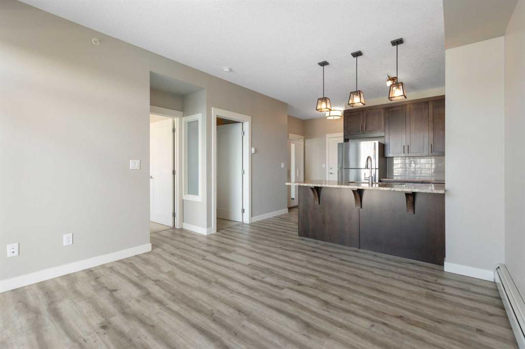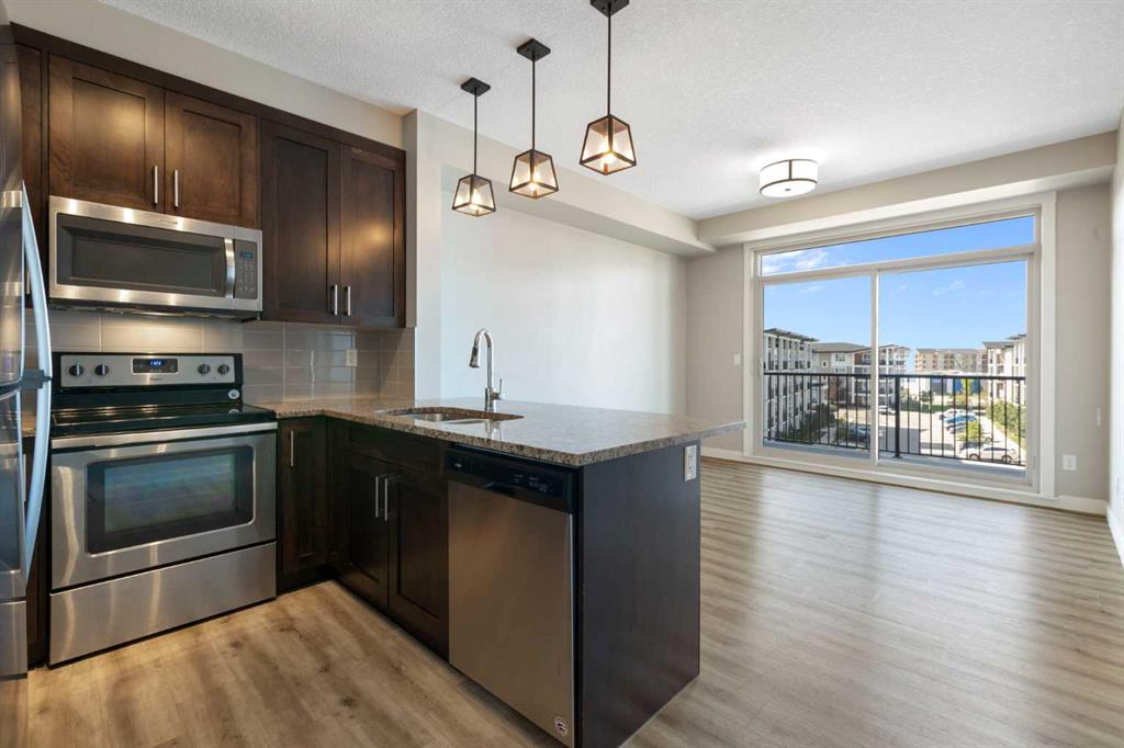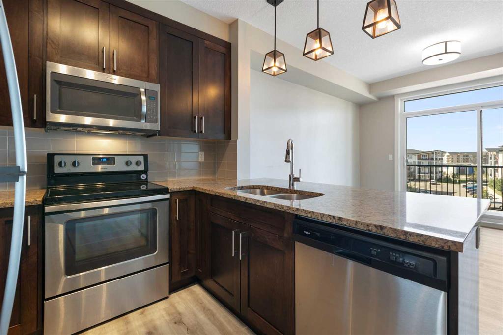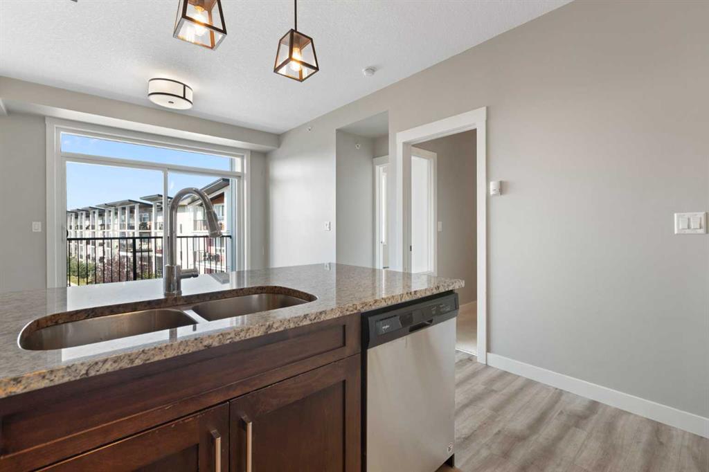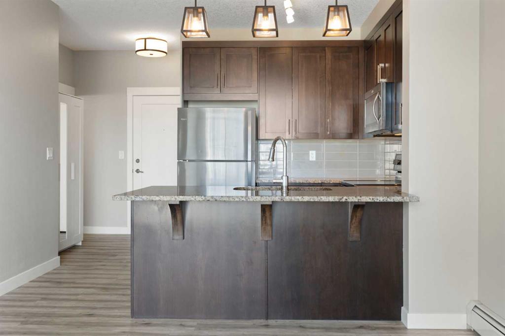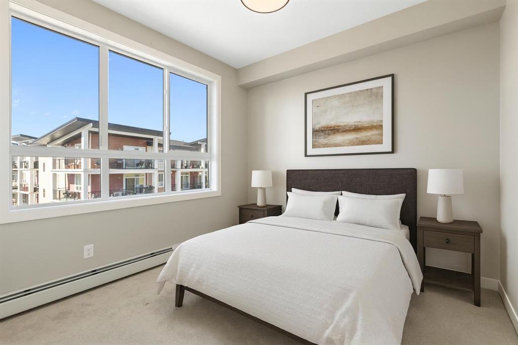 Perched on the top floor with sweeping mountain views, this bright & airy two-bedroom home is the perfect blend of style, comfort, and convenience. Oversized windows and soaring 9-foot ceilings flood the space with natural light, creating an airy, inviting atmosphere that feels instantly like home. The kitchen is a true showstopper—rich maple cabinetry, sleek granite countertops, and a spacious island with seating for three sets the stage for everything from quick morning coffees to lively evenings with friends. Stainless steel appliances keep the look polished and modern, while the open-concept design ensures conversations flow as effortlessly as the layout itself. Both bedrooms are generously sized, with plush carpet underfoot in the sleeping areas and upgraded vinyl plank flooring carrying throughout the main spaces. Everyday ease continues with in-suite laundry, featuring a stackable washer and dryer discreetly tucked away. This unit comes with a window AC unit to keep you cool during the warm summer days. Step outside onto your southwest-facing balcony and exhale—it’s your private retreat with sunshine all afternoon and calming vistas of mountains and green space. Down below, your heated underground parking stall and separate storage unit add peace of mind and year-round comfort. Living here means being part of Walden, a vibrant and growing community where everything is at your doorstep. The plaza across the street offers endless shops and dining experiences. Parks, playgrounds, sports fields, and trails weave through the neighbourhood, while quick access to MacLeod and Stoney Trails makes commuting effortless—and weekend escapes to the Rockies just 45 minutes away. This is more than a condo. It’s a lifestyle, wrapped in mountain views and modern finishes—all with low monthly fees. Don’t wait—this unit is calling your name & it’s ready to welcome you home.
