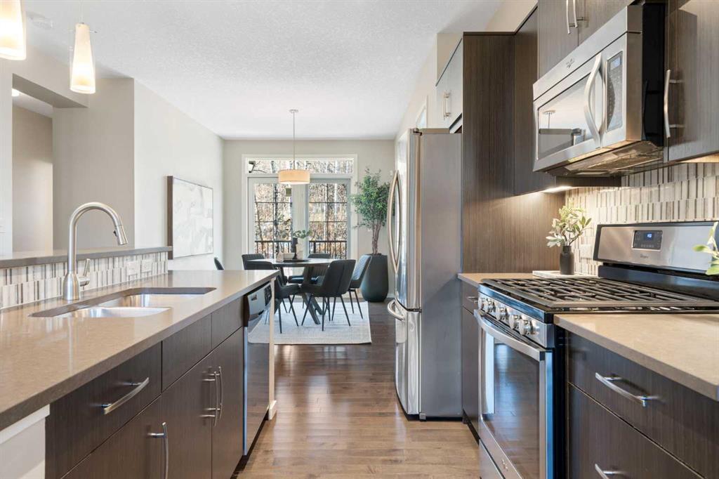 Backing directly onto the serene nature of the Aspen Grove, 420 Ascot Circle SW feels like a retreat, yet sits just minutes from schools, shops, transit, and Calgary’s most sought-after amenities. From the moment you arrive at this end-unit townhome in the heart of Aspen Woods, there’s a quiet sense of escape - an elevated lifestyle shaped by privacy, sunlight, and an effortless connection to nature. Step inside and the home unfolds across 1,569 sq ft of thoughtfully designed living space, each level giving you exactly what you need - function below, flow in the middle, and calm above. The ground floor sets the tone for convenience with a rare tandem double HEATED GARAGE, extra-deep and ready for two vehicles plus bikes, gear, a workshop, or the storage that makes day-to-day life feel organized. Upstairs, the main floor opens like a breath of fresh air. Sunlight pours in from both the front and back, washing across rich hardwood floors and a layout designed for connection. The living room feels warm and inviting, anchored by an electric fireplace that naturally draws people together. At the centre, an impressive kitchen becomes the heart of the home - oversized island, gas stove, stainless steel appliances, generous workspace, and a perfect flow for cooking, hosting, or simply gathering. Just beyond, the dining area opens to a private rear deck overlooking the nature reserve, where evening dinners, quiet mornings, and summer BBQs (with a built-in gas line) become part of daily life. A discreet powder room completes this level, adding comfort without interrupting the clean, open aesthetic. The top floor is all about rest, rhythm, and effortless living. Wake up in a primary suite that feels peaceful and elevated, with serene views of aspen trees, a walk-in closet, and a beautiful 3-piece ensuite with walk-in shower. Two additional bedrooms - one with its own walk-in closet - offer flexibility for kids, guests, or the perfect home office. A full 4-piece bathroom, upstairs laundry, and thoughtful hallway storage make this level feel remarkably efficient, with not a square foot wasted. Every detail here was chosen for modern comfort: air conditioning for warm summer days, hardwood where you want durability, plush carpet where you want warmth, and an end-unit orientation that keeps the home bright, quiet, and private. Beautifully maintained, intelligently designed, and set against one of Aspen’s most peaceful natural backdrops, this home invites you to step into a lifestyle that balances convenience with calm, openness with privacy, and everyday living with a touch of luxury. Come experience how effortlessly life unfolds at 420 Ascot Circle SW - your next chapter starts here.
